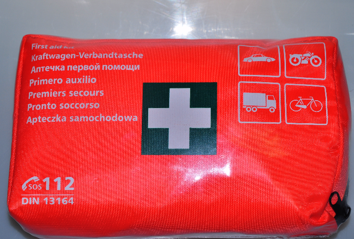 Apteczka samochodowa w nylonowym opakowaniu. Produkt spełniający wymagania normy DIN 13164 oraz normy Unii Europejskiej. Etui zostało wyposażone w rzep umożliwiający umocowanie apteczki do tapicerki samochodowej.