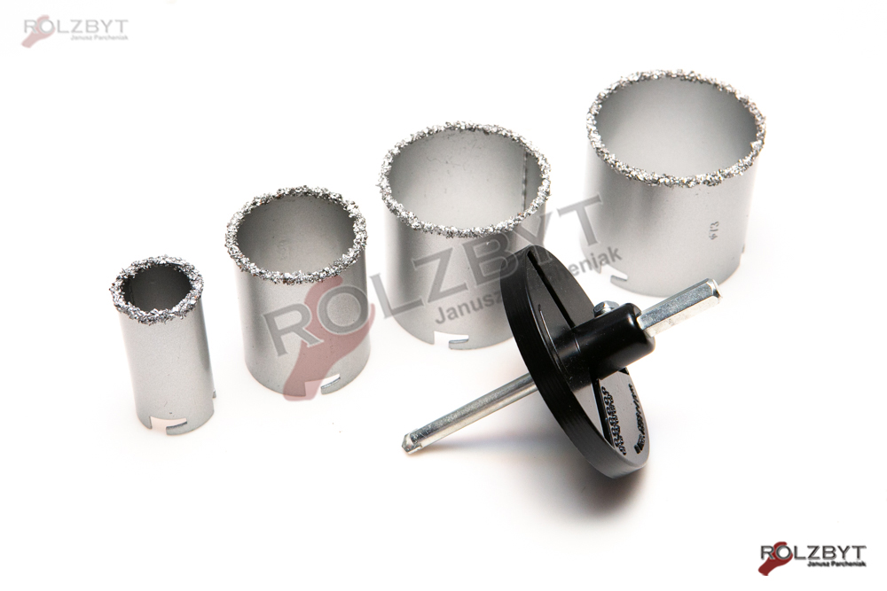 Profesjonalny zestaw koronek z nasypem z węglika wolfarmu do wycinania otworów w płytkach ceramicznych oraz płytach G/K. Wiercenie odbywa się na sucho.