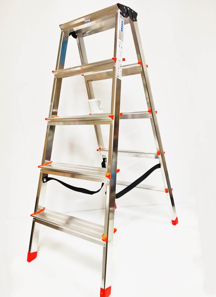 Zajmuje mało miejsca po złożeniu . Profilowane stopnie o głębokości 80 mm zapewniające bezpieczne wchodzenie i wygodne korzystanie z drabiny. Zaokrąglenie przedniej krawędzi stopni zabezpiecza przed urazami w trakcie użytkowania.