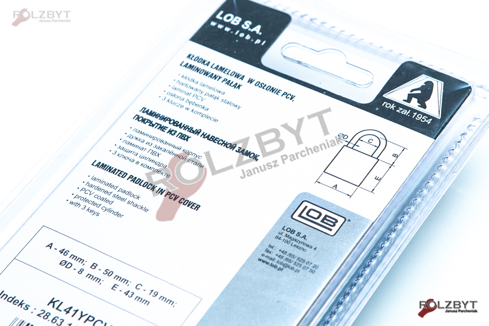 Kłódka lamelowa zatrzaskowa w osłonie PCV. Cechą charakterystyczną tej kłódki jest lamelowa konstrukcja korpusu i pokrycie tworzywem również pałąka kłódki. Lamelowa konstrukcja zwiększa wytrzymałość kłódki na zniszczenie w wyniku uderzeń, a wykorzystanie PCV pozwala ograniczyć ilość uszkodzeń w postaci otarć i zadrapań powierzchni będących w bezpośrednim kontakcie z korpusem i pałąkiem kłódki po jej zamknięciu.