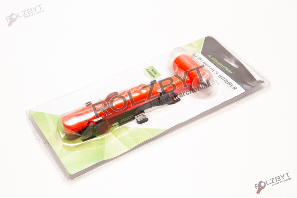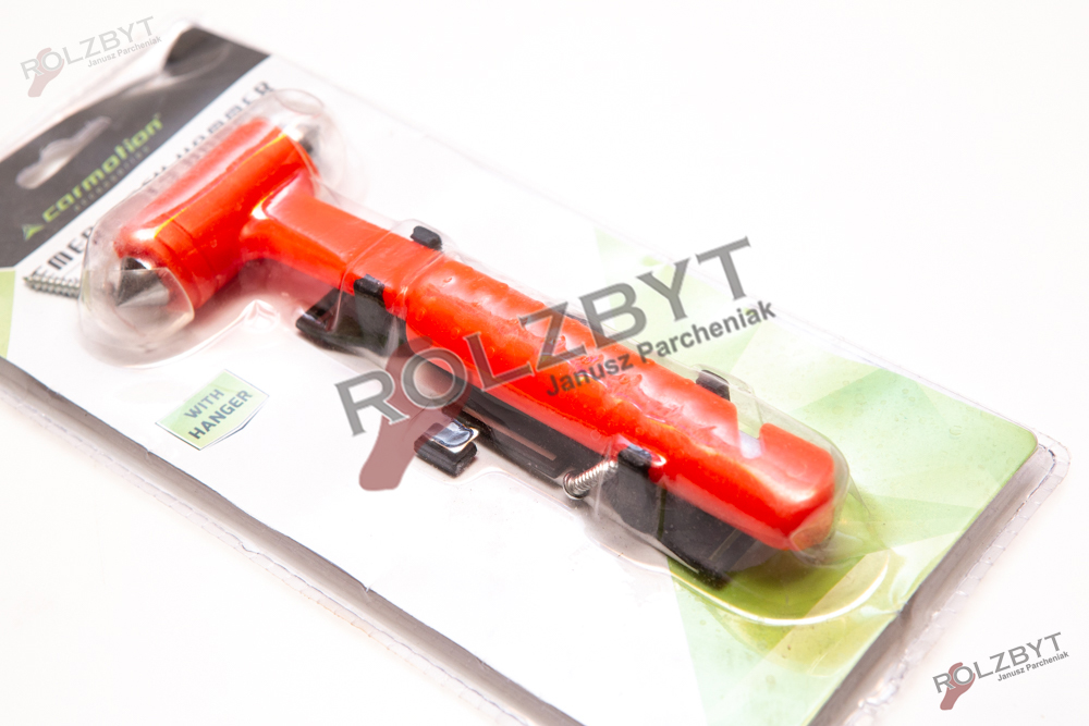 Młotek bezpieczeństwa z nożem do pasów bezpieczeństwa i wieszakiem do montażu w samochodzie.