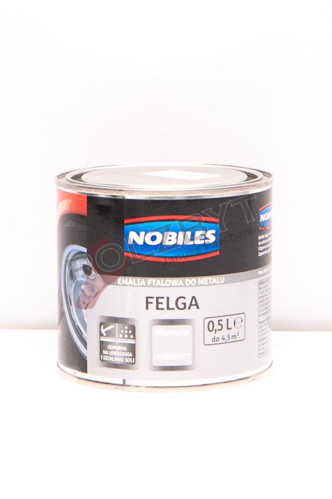 Nobiles Felga to emalia ftalowa przeznaczona do ochronnego i dekoracyjnego malowania felg samochodowych, jak również innych powierzchni metalowych, gdzie wymagany jest kolor srebrzysty z efektem metalicznym. Powłoka emalii o wykończeniu półpołysk charakteryzuje się dobrą przyczepnością do podłoża oraz odpornością na działanie czynników atmosferycznych i mechanicznych. Wyrób przeznaczony do malowania na zewnątrz pomieszczeń.