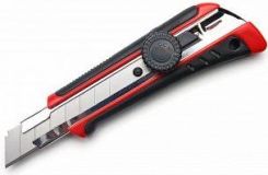 PRO Nóż uniwersalny, PR-90-01. Wysokiej jakości nóż uniwersalny wykonany z bardzo dobrych materiałów, gwarantujących długotrwałe użytkowanie. Wytrzymała obudowa z gumowymi elementami zapewniającymi pewny chwyt podczas pracy. Innowacyjna konstrukcja rękojeści z zasobnikiem na 2 zapasowe ostrza. Blokada ostrza poprzez pokrętło z boku obudowy.