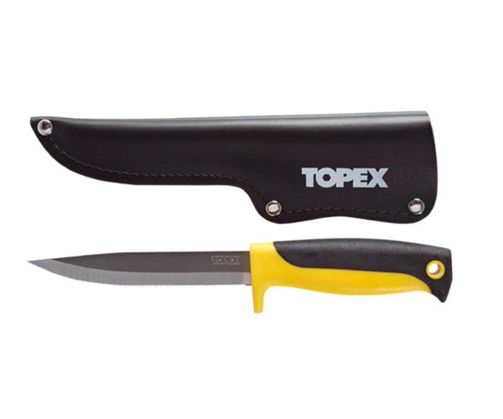 Ostrze noża wykonane ze stali nierdzewnej Uchwyt wykonany z tworzywa, posiada gumowe, antypoślizgowe wkładki Jelec zapobiega zeslizgnięciu się dłoni na ostrze podczas pracy W komplecie skórzana kabura na nóż Długość ostrza 120 mm