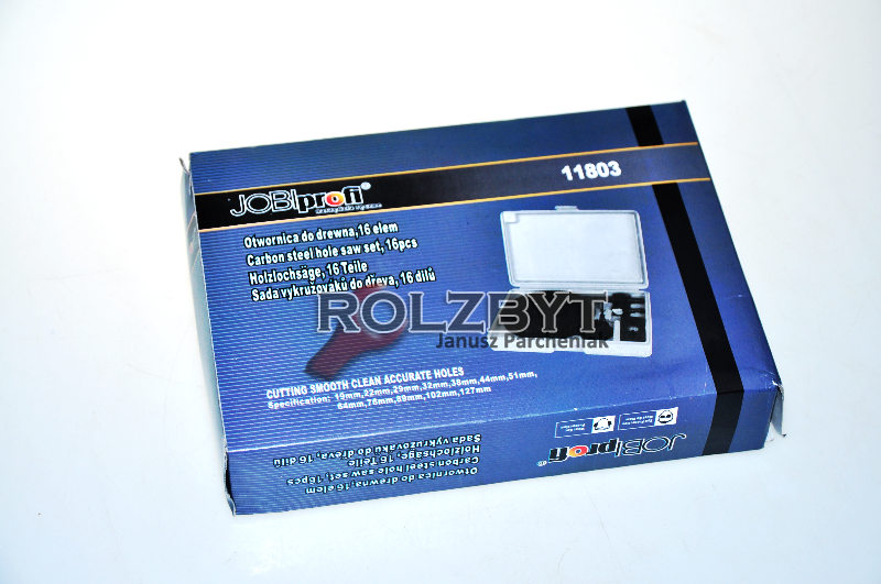 JOBIPROFI 11803 Otwornice do drewna , 16 elementów.Zestaw przeznaczony do wycinania otworów w drewnie, płytach kartongips i kartonowych . Posiada przedłużkę, która doskonale pasuje w uchwycie standardowej głowicy zaciskowej w każdej wiertarce.Otwornice posiadają wieniec zębaty wykonany z węglików spiekanych HM.