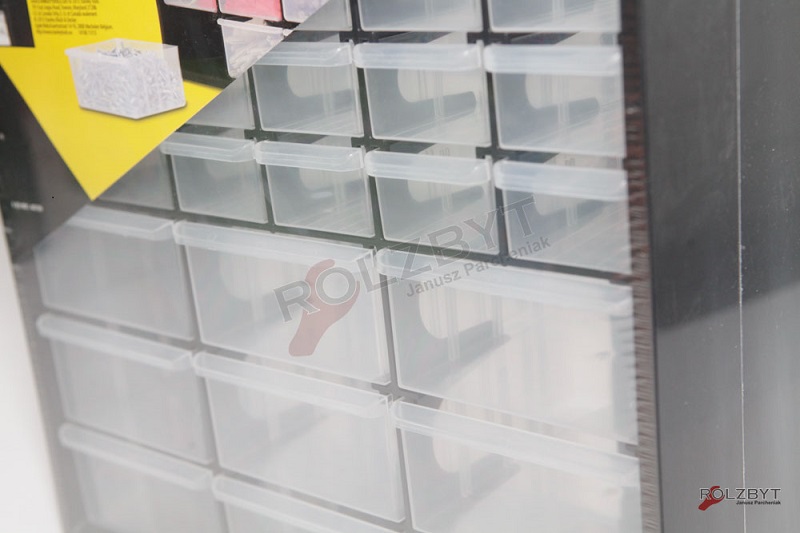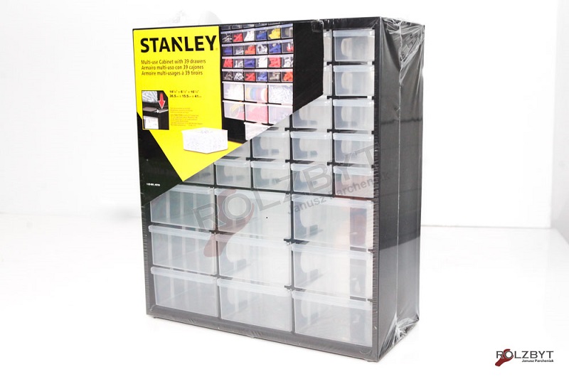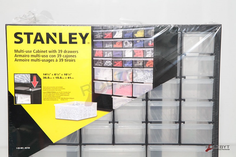 Organizer z 39 szufladami firmy Stanley. Produkt przeznaczony dla osób, które posiadają dużą ilość drobnych elementów, a chcą mieć wszystko w jednym miejscu.