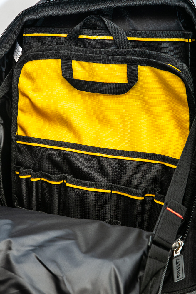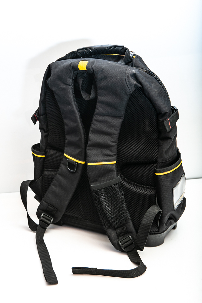 - Nieprzemakalne plastikowe dno zabezpieczające narzędzia przed wilgocią i wzmacnia sztywność plecaka,