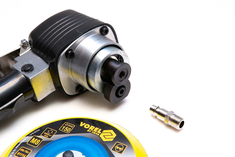 Szlifierka jest wyposażona w złączkę pozwalającą przyłączyć ją do układu pneumatycznego. Szlifierka jest wyposażona w tarczę o średnicy 150 mm. Do montażu tarczy nie są wymagane żadne narzędzia dodatkowe.