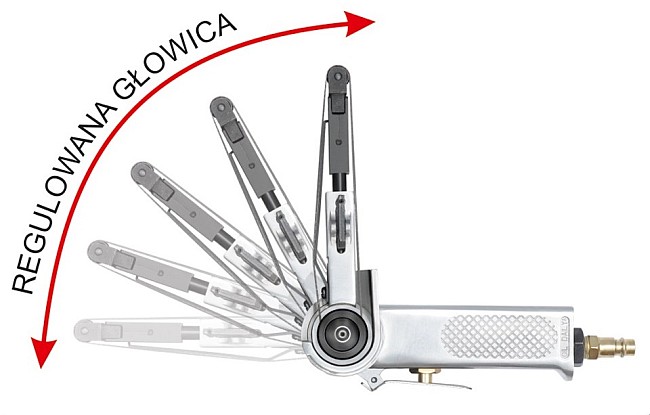Profesjonalna taśmowa szlifierka pneumatyczna. Rozmiar taśmy 10x330 mm, prędkość robocza 20 000 obr/min. Przyłącze powietrza 1/4". Głowica robocza regulowana.
