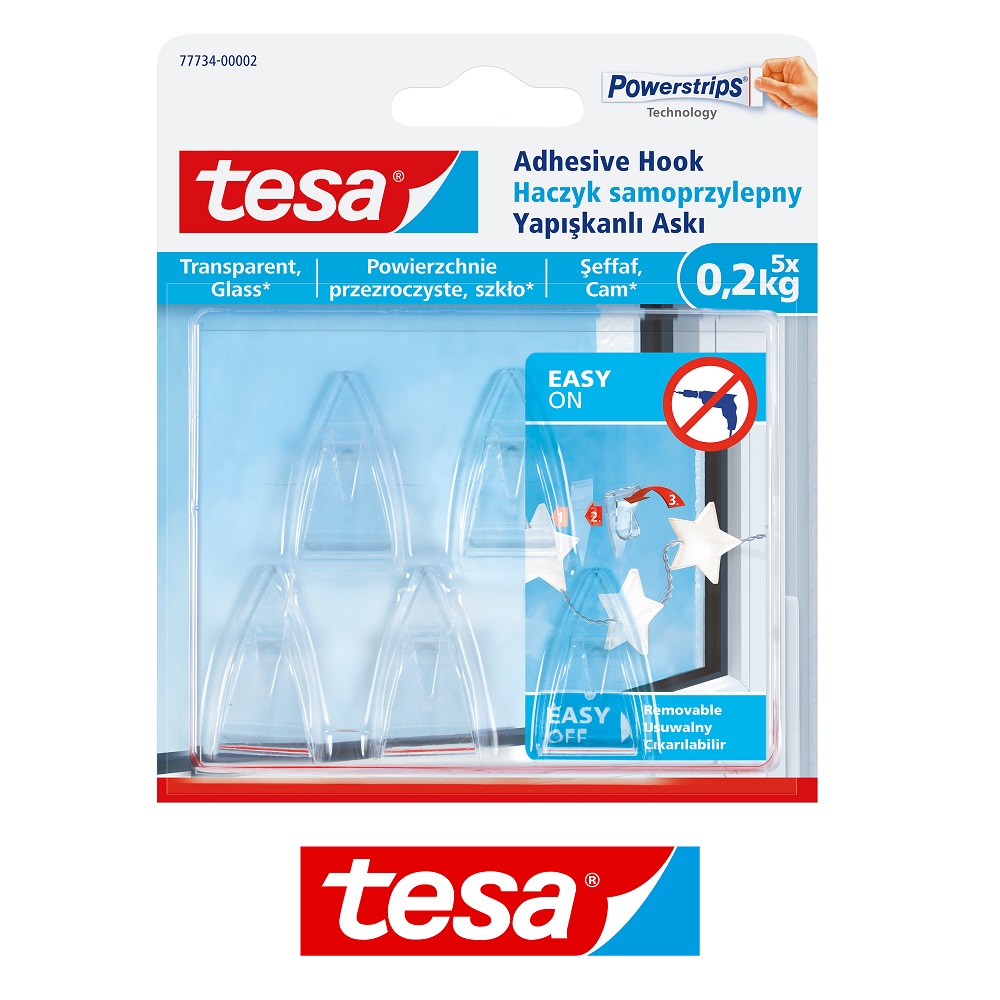 Tesa® haczyk dekoracyjny 0,2 kg, bardzo dobrze sprawdza się przy wieszaniu lekkich dekoracji na szybach, szkle czy też lustrach. Haczyk jest przezroczysty i prawie nie widoczny. Utrzyma przedmiot o wadze do 0,2 kg. Haczyk można bardzo prosto zdemontować i założyć w innym miejscu. Umożliwiają to plastry powerstrips na które przyklejane są haczyki.