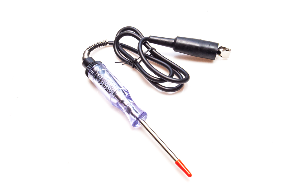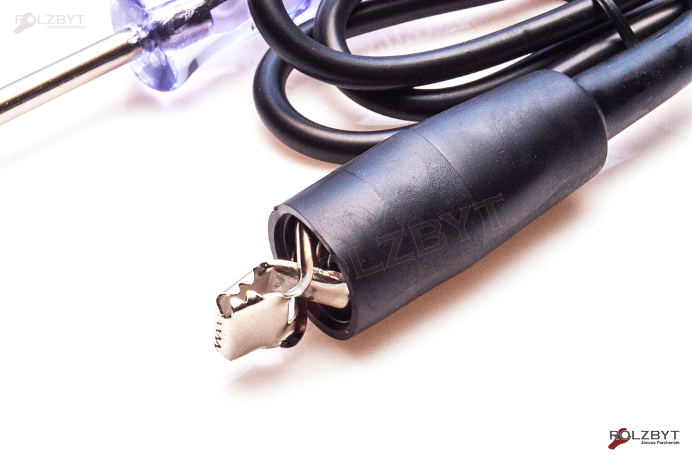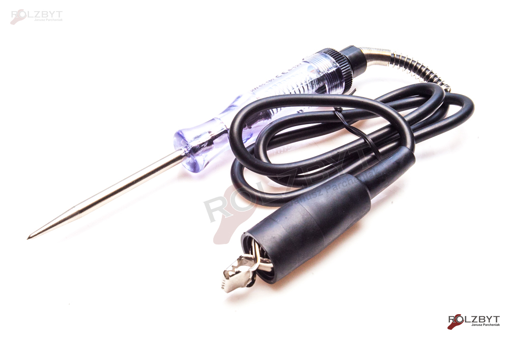Cechy: wskaźnik posiada stalowy grot, transparentna obudowę, żarówka sygnalizująca napięcie, przewód długość 90cm ze złączką zaciskową, zakres pomiarowy: 6 - 12 V, masa: 170g,