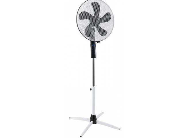 DA-1608 to doskonałej jakości wentylator stojący marki DESCON o średnicy 40 cm z pilotem oraz wyświetlaczem LCD. Dzięki ruchomej głowicy powietrze rozprowadzane jest po całym pomieszczeniu. Wyposażony został w pięć śmigieł oraz możliwość ustawienia wysokości jak i kąta nachylenia. Dodatkowym atutem jest podstawa złożona z naprzeciwległych nóżek które dodatkowo zabezpieczają przed niekontrolowanym pochyleniem czy też upadkiem. Śmigła zabezpieczone zostały gęstą metalową osłoną.