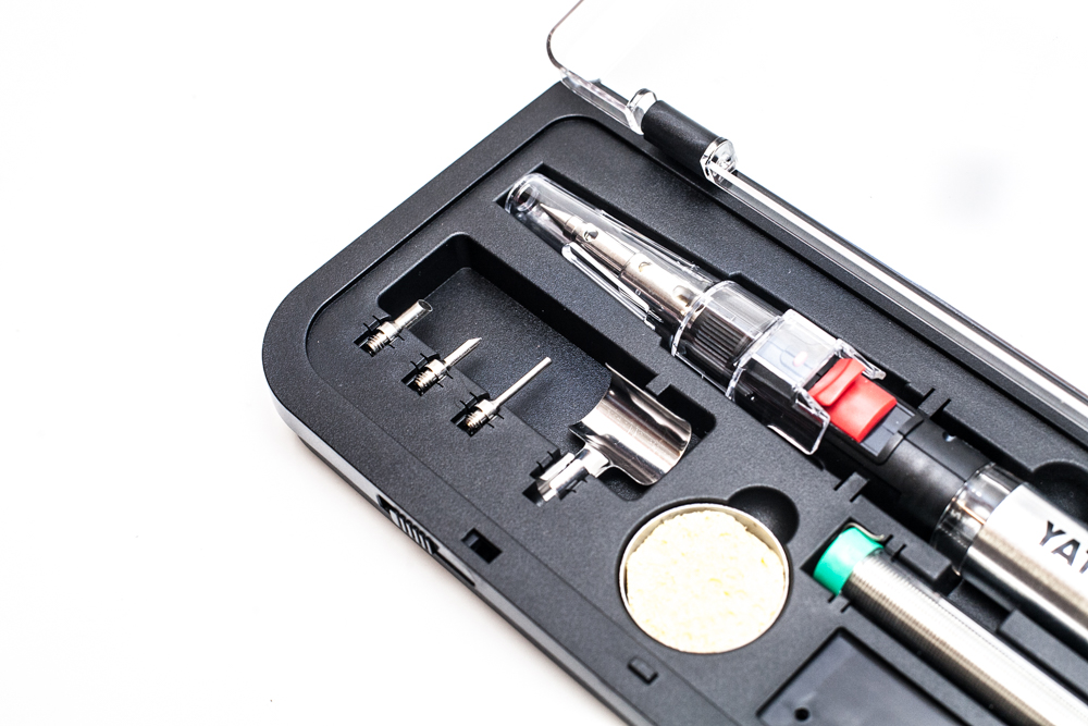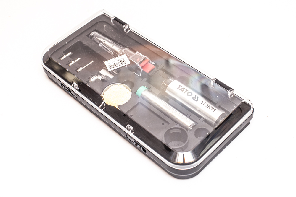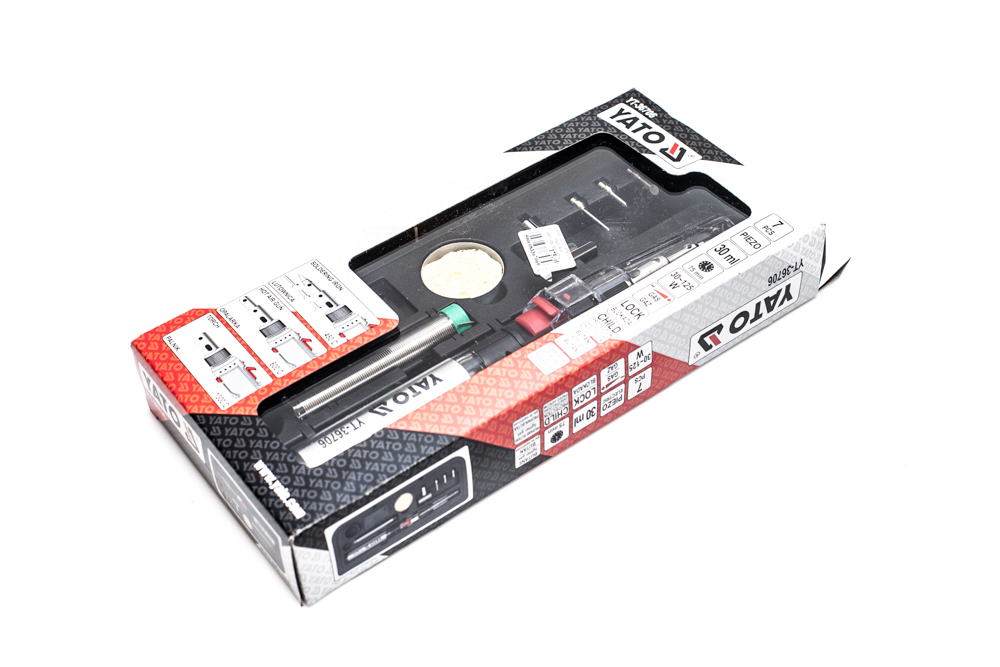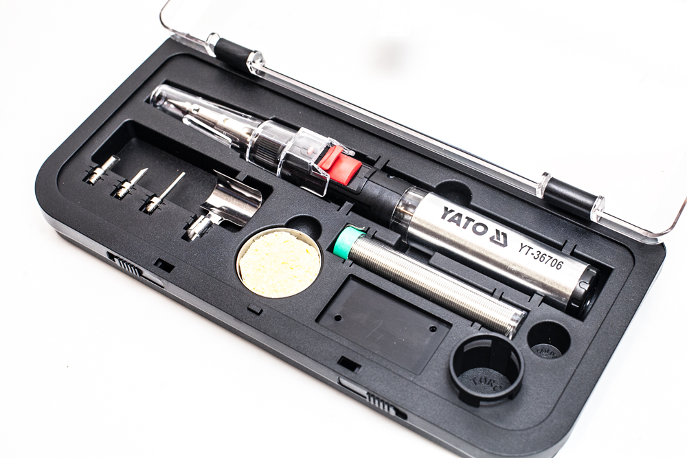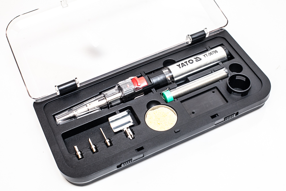Lutownica gazowa 3 w 1 z zestawem z zapłonem piezo zasilana gazem zapalniczkowym - butanem o mocy 30-125W. Posiada funkcję lutownicy (max temp 450º C), opalarki (max temp 600º C) oraz palnika (max temp 1300º C). Pojemność zbiornika wynosi 30ml co pozwala na pracę do 75min. Okienko inspekcyjne w korpusie umożliwia kontrolę poziomu gazu. W skład zestawu wchodzi cyna, gąbka, 4 różne groty oraz dysza. Ponadto specjale pudełko ma funkcję stojaka na lutownicę oraz cynę tworząc mobilną stację roboczą. Palnik przeznaczony jest do lutowania cynowego, pirografii (wypalania w drewnie), opalania czy obkurczania materiałów termokurczliwych. Palnik może być wykorzystywany do lutowania rur Cu, odkręcania zapieczonych śrub, zgrzewania czy rozmrażania oraz do gięcia i formowania na ciepło.