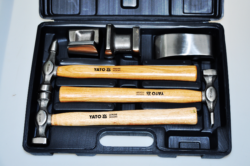 Zestaw podstawowych narzędzi blacharskich. Trzy młotki o różnych profilach obuchów, osadzone na trzonkach z drewna hikorowego, cztery kształtki stalowe służące do profilowania blachy. Odkuwane na zimno, szlifowane i polerowane. Zestaw w walizce z tworzywa