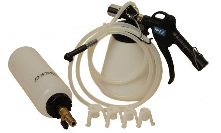 Zestaw pozwala na jednoosobowe wykonanie napełnienia oraz odpowietrzania układu hamulcowego przy pomocy ciśnienia z instalacji pneumatycznej (kompresora)