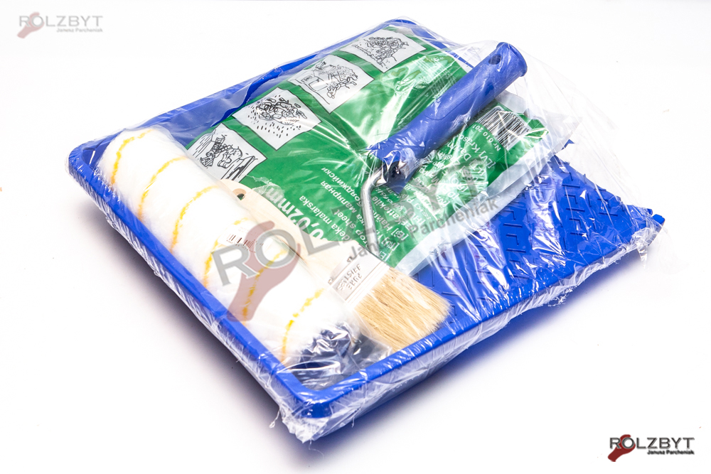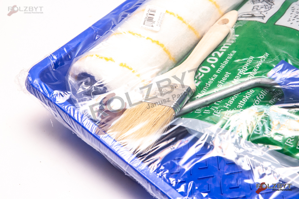 Gotowy zestaw malarski. Zawiera folię malarską, pędzel angielski, rolkę girpaint 25cm oraz kuwetę.