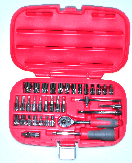Zawartość: nasadki 1/4" 4, 4.5, 5, 5.5, 6, 7, 8, 9, 10, 11, 12, 13, 14 mm; Torx E4, 5, 6, 7, 8, 10, 11; Torx T8, 9, 10, 15, 20, 25, 27, 30, 40; przedłużka 50, 100 mm plus przesuwna; przegub; grzechotka 1/4"