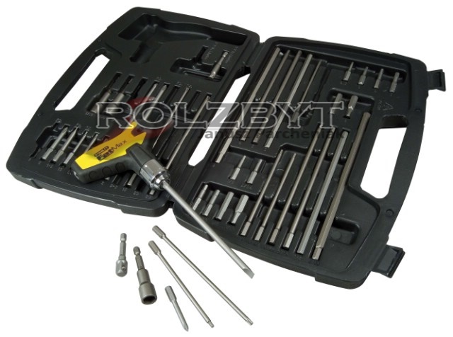 W zestawie: rękojeść, walizka, bity: - PZ1; PZ2 x 2; PZ3 /35mm - PZ1; PZ2 /100mm - PZ1; PZ2; PZ3 /150mm - PZ2 /200mm - PH1; PH2 /50mm - PH1; PH2 /150mm – Pł. 2.5; 3x2;4; 4.5; 5; 6; 8mm /35mm – PŁ. 6-8 /50mm – Pł. 6 /150mm – imbus: 2.5; 3mm /100mm - imbus: 4; 5; 6mm /150mm - imbus: 8mm /200mm - T15; T20; T25 /50mm - T15; T20; T25 /150mm - nasadki 8, 10, 12mm - ¼ adaptor x 2